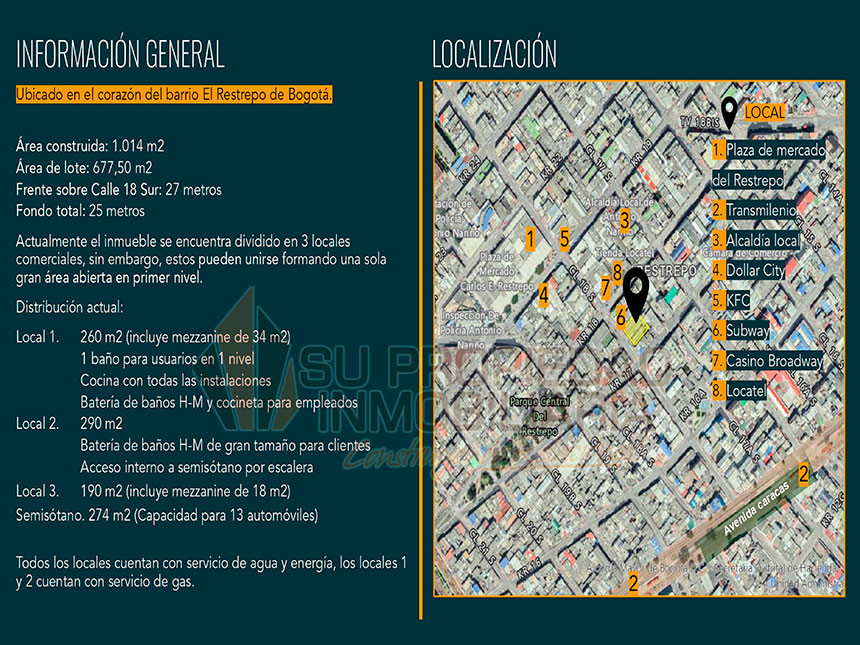 Local en arriendo en El Restrepo. ¡Este local es una oportunidad única! Cuenta con electricidad y acueducto, pisos en Cerámica/baldosa; se divide en 3 locales comerciales, sin embargo, estos pueden unirse en una gran área de 1.014m2 abierta en primer nivel. El local No.1 tiene 260m2(incluye mezanine de 34m2) 1 baño, cocina con todas las instalaciones, batería de baños mixtos y cocineta para empleados. El local No. 2 tiene 290m2, batería de baños mixtos, acceso interno a semis-sótano por escalera y una bodega en el segundo nivel. El local No. 3 tiene 190m2(un mezanine de 18m2) semisótano 274m2(Capacidad para 13 automóviles). Este espacio es perfecto para tu negocio. Si estás buscando un lugar para expandir tu empresa, este es el lugar ideal. Fácil acceso por la Av. Caracas, Calle 18 Sur y Av. Primera de Mayo. Cerca de Plaza de Mercado Restrepo y Estación Fucha. No pierdas la oportunidad de tener tu propio espacio. ¡Contáctanos ahora para obtener más información! 0.1.
